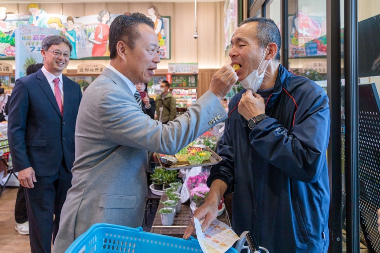 山口縣民眾一早湧入超市,紛紛選購嘉義縣優質農特產品,顯示品牌在當地已成功建立高辨識度與市場忠誠度,翁縣長也親自邀請民眾品嚐,消費者大讚蜜甘味鳳梨、鳳梨酥都好吃,擄獲大人、小孩的胃口,要買回家與家人親友共享,小朋友吃完一塊還要一塊,大喊「喔伊細!」