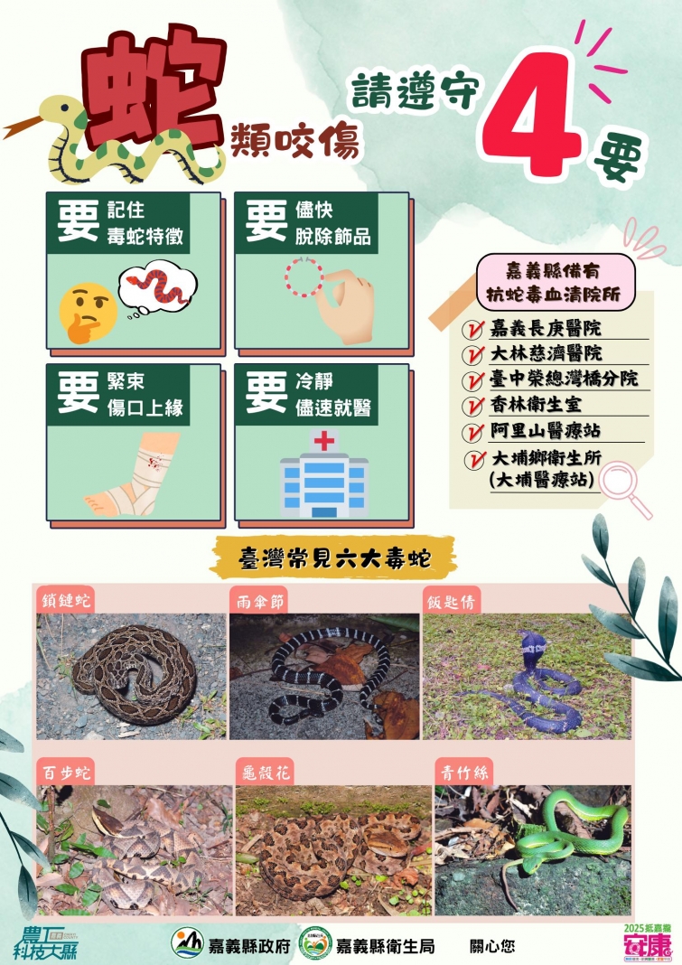 若不慎遭蛇咬應保持冷靜,避免劇烈活動,儘速就醫並記住毒蛇外觀特徵,治療以注射抗蛇毒血清為主,嘉義縣大林慈濟、長庚醫院及灣橋分院、阿里山及大埔鄉衛生所皆備有抗蛇毒血清。