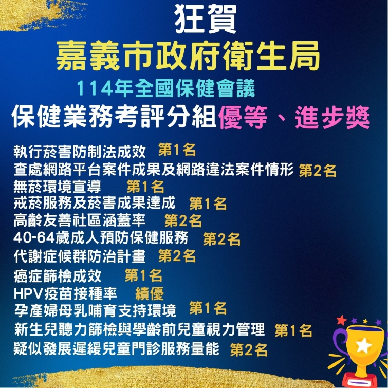 衛生福利部國民健康署表揚113年保健業務推動績優縣市,嘉義市衛生局榮獲執行菸害防制法成效、查處網路平台及網路違法案件、無菸環境宣導、戒菸服務及菸害成果達成、高齡友善社區涵蓋率、40-64歲成人預防保健服務、代謝症候群防治計畫、癌症篩檢成效、HPV疫苗接種率、孕產婦母乳哺育支持環境、新生兒聽力篩檢與學齡前兒童視力管理、疑似發展遲緩兒童門診服務量能等獎項,更獲頒保健業務分組「優等獎」及進步獎,基層同仁平日的辛勞終獲肯定。