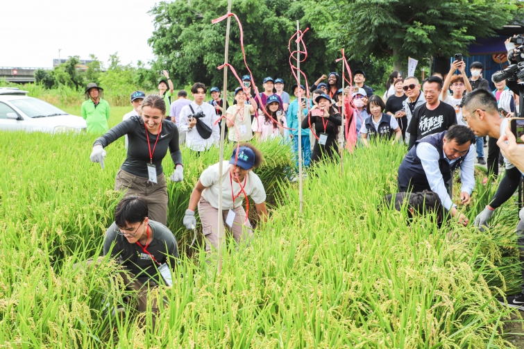 參訪尾聲的割稻體驗在稻田中熱鬧展開,由USF學生組隊,對抗由翁章梁縣長、縣議員江志明、劉雅文、勞青處長陳奕翰與民雄商圈理事長許聖昌組成的嘉義隊,與美國青年朋友一同彎腰割稻,比賽過程歡笑聲不斷。