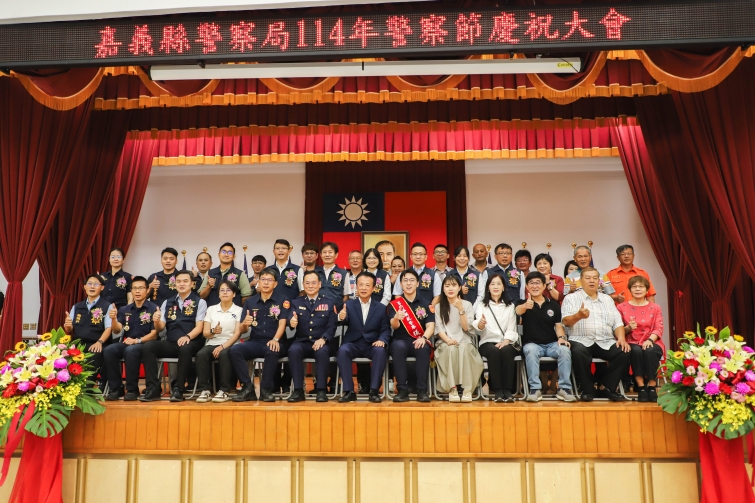 嘉義縣警察局今12日舉辦警察節慶祝大會,嘉義縣長翁章梁、嘉義縣警察局長李權哲向績優人員頒獎並表達感謝之意。