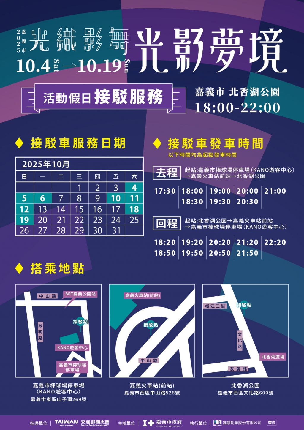 「2025嘉義市光織影舞」將於10月4日至10月19日在北香湖公園盛大登場。嘉義市政府為方便民眾前往欣賞光影藝術展,特別規劃交通接駁專車,於10月4日至6日、10月10日至12日,以及10月18日至19日行駛,串連嘉義市棒球場停車場(KANO遊客中心)、嘉義火車站前站與北香湖公園,提供安全、便利又環保的交通選擇,邀請全國民眾搭乘大眾運輸,輕鬆暢遊光影盛宴。
