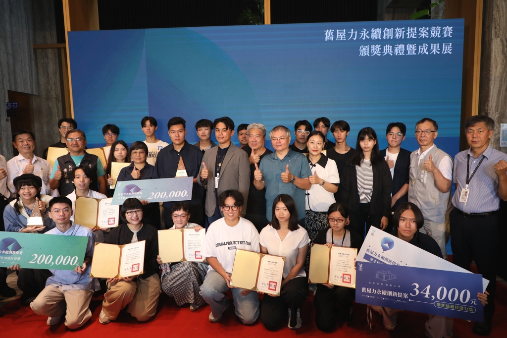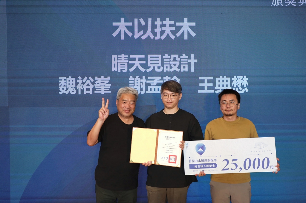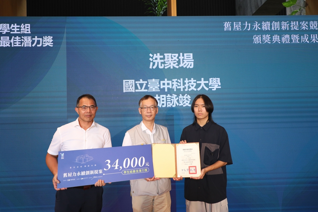 在頒獎典禮中,林瑞彥副市長代表黃敏惠市長頒發感謝獎勵金給4間老屋的屋主,感謝他們讓自己的老屋當設計標的成就本次競賽。今日揭曉的大獎得主分別為:南華大學徐瀚佐、周承雋、陳亮宇「從家屋到文屋-轉譯木都記憶的共享棲所」榮獲學生組創新設計首獎;國立成功大學陳玟穎、林曉陽、卓敬庭「啟•家-三明印刷所空間再生計畫」榮獲學生組生活設計首獎;國立臺中科技大學胡詠竣「洗聚場」榮獲學生組最佳潛力獎;原型建築有限公司「華宮旅社 RESET」榮獲社會組創新設計首獎;IMPP studio廖于萱、洪芯培「木宿華宮:老旅館的重生之路」榮獲社會組生活設計首獎;晴天見設計「木以扶木」榮獲社會組最佳潛力獎。