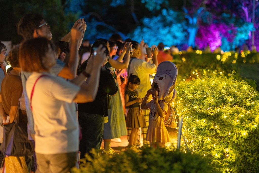 中秋三天連假期間,還有街舞冠軍團體「築夢者」、鍋爐爺爺與柏青哥等接力演出,現場熱力不斷;另還有近60攤位的「奇幻市集」同樣人潮爆滿,藝術手作、特色餐飲與發光蘑菇座椅,讓大小朋友邊逛邊拍,體驗滿滿童趣氛圍。