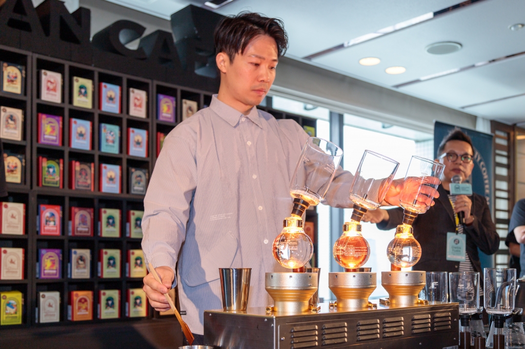 上午咖啡分享會最大亮點,就是邀請2024年世界虹吸壺冠軍張維欣與日本大阪烘豆冠軍岩崎裕也,採用阿里山藝伎日曬及索恩娜水洗咖啡豆示範手沖技巧,並與民眾交流互動,跨國合作演示技術吸睛,展示嘉義咖啡的深厚風味。