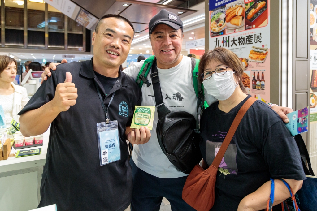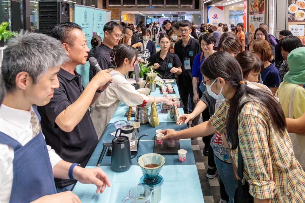 同日下午,11家咖啡莊園業者設置展售專區,吸引日本消費者品嚐嘉義的濃郁滋味與風情,翁縣長親自與日本手沖冠軍新田衣祥示範手沖技巧,介紹嘉義阿里山咖啡的產地特色,讓消費者體驗嘉義咖啡的香氣與層次。