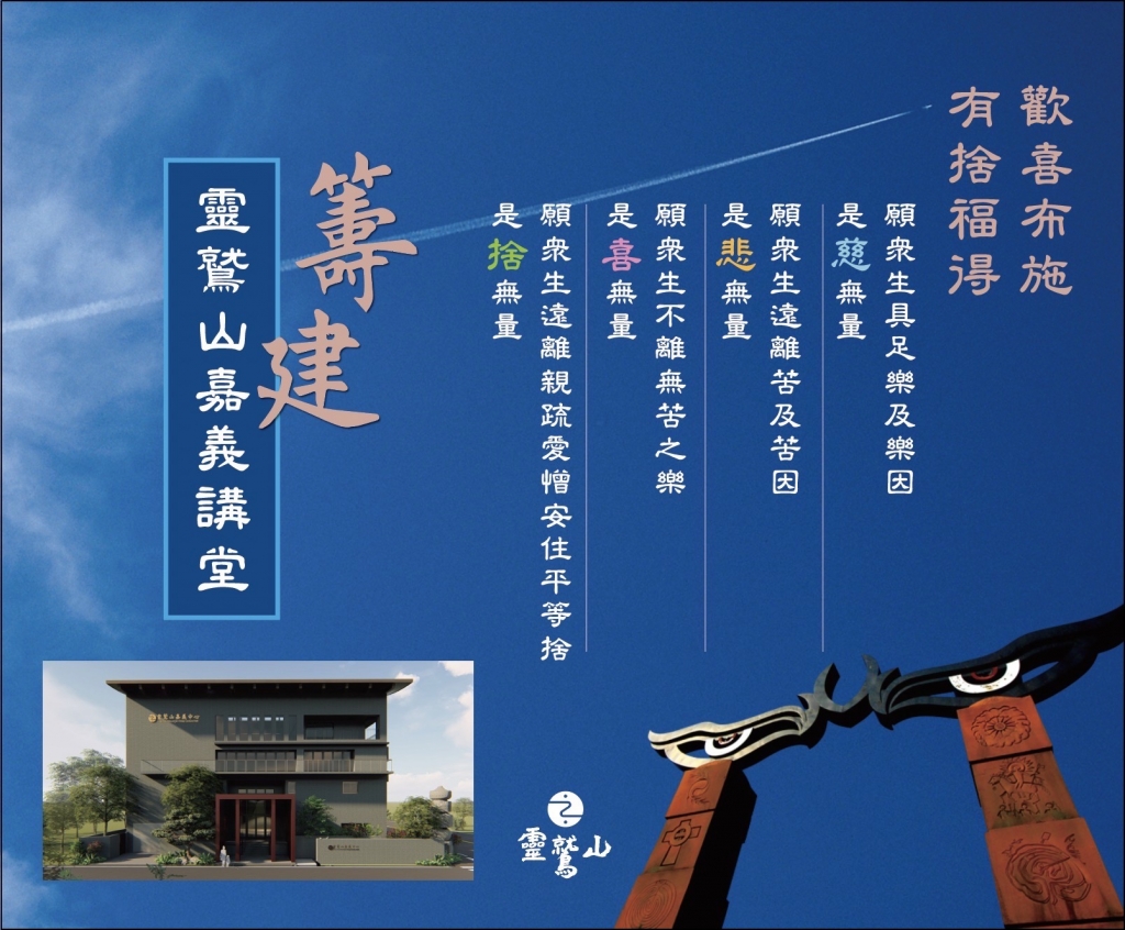 音樂裡有願力,旋律中見希望!在這個變動不安的時代,人人渴望有一處安頓身心的所在。靈鷲山長年深耕台灣各地,嘉義中心更陪伴在地共修超過20年。心道法師說:「講堂,是心靈的地標,是我們找到本心的所在。」新講堂的建設需要眾志成城,一磚一瓦的背後,是護法善信的善心和汗水,人人發願傳承佛陀法教,情義相挺籌建講堂,為嘉義人鑄造生命的新希望,讓愛在這片土地上持續發光。