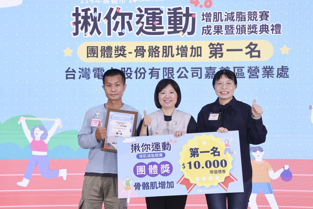 本屆團體成績同樣令人矚目。台灣電力股份有限公司嘉義區營業處榮獲本屆「肌肉量增加最多」團體獎冠軍。代表領獎的賴郁凱先生表示,公司響應本次競賽外,內部也自主辦理減重活動,同仁在雙重激勵下,相互鼓勵、積極運動,最終成功奪冠,展現團隊齊心努力的成果。