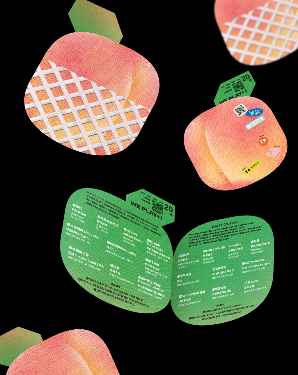 文化局長謝育哲表示,本次城市走讀「320+1嘉義城市博覽會──播放嘉義 WE PLAY+1」三部曲,希望大家起身離開座位,召集大家走進城市、認識嘉義的其中的一個環節。參與者除享受實地走讀的深度體驗外,更可搭配「城市百位嘉義播放清單」體驗,領取城市地圖按圖索驥探訪百家特色店舖,聆聽店主精心挑選代表嘉義精神的歌曲,感受每家店舖獨特的氛圍與故事。此外,還能參與「給桃城的生日祝福」活動,在20家桃城主題串聯店家品嚐主題飲食,購買主題商品,透過集章活動採摘一顆新鮮美味的嘉義市。凡集滿5點,可於320+1嘉義市城市博覽會市集「嘉義大市」服務台兌換 「A.P.P X We Play+1」活動提袋(限量800個)成為桃袋郎;集滿20點,可參與12/27(六)下午4-5點的城市走讀「隱藏版路線」城市解壓縮場(屆時請攜帶集滿之集點卡做為信號辨識物,準時於市府門前集合),三大體驗內容相輔相成,讓民眾能用走讀、聆聽與品嚐等多感官方式,深入認識這座城市。