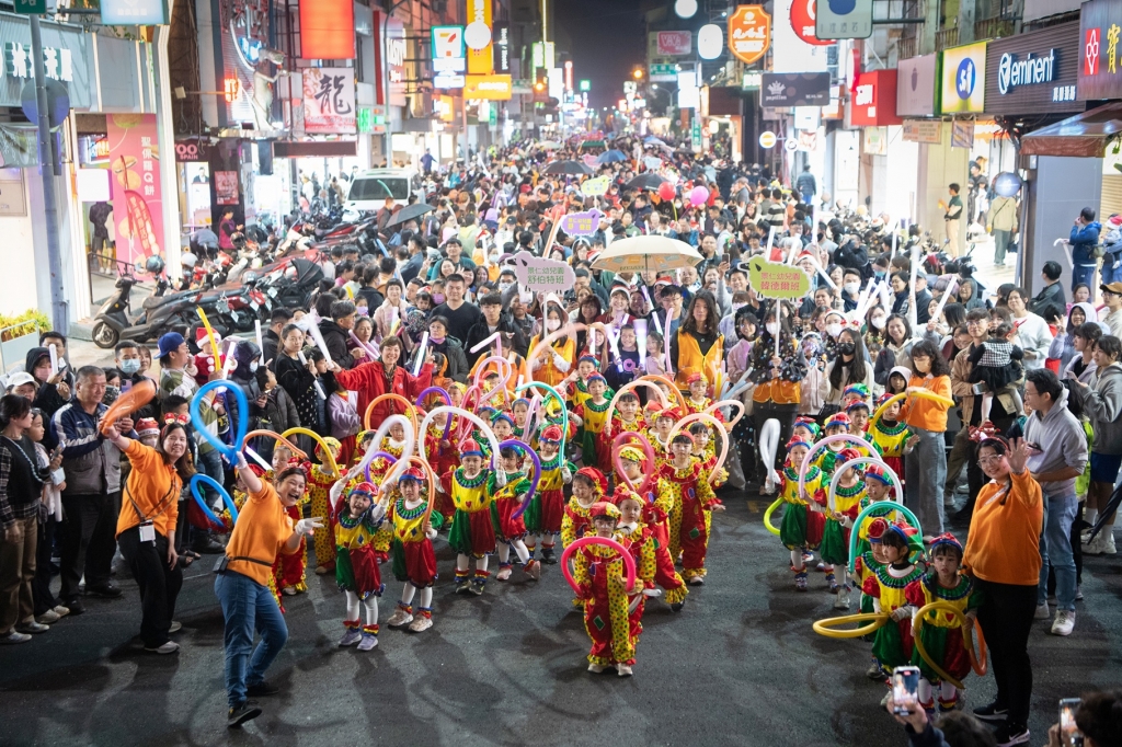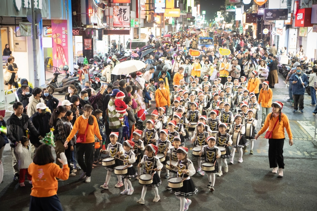 活動尾聲,在蒲英雄主教與戴乃宣議長的莊嚴祝禱下,以及聖馬爾定醫院聖詠團溫暖人心的合唱聲中,黃敏惠市長與所有嘉賓共同倒數,璀璨點亮聖誕燈飾,場面溫馨、喜樂滿溢。點燈儀式後,精心打扮的大小朋友組成踩街隊伍,紛紛化身為聖誕老人、俏皮天使等創意造型,從中央廣場出發,途經嘉義市地標中央噴水池,最終熱鬧湧入人聲鼎沸的文化路夜市。