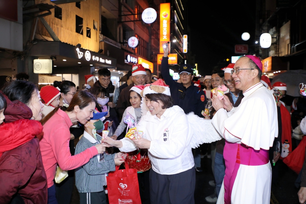 為傳遞聖誕節的平安與喜樂,嘉義市「希望禧年 光臨諸羅」平安夜踩街報佳音活動已邁入第23年,於今(19)日晚間中央廣場盛大登場。今年市府聯合基督教、天主教各大教會、各級學校、社團等共同舉辦,吸引24個優秀隊伍、超過2,000名熱情民眾盛裝參與;來自日本宮城縣加美町的貴賓團特地跨海參加,為這場嘉義限定的聖誕晚會增添了濃厚的國際友誼色彩。嘉義市長黃敏惠與天主教嘉義教區主教浦英雄、台灣基督長老教會嘉義中會議長戴乃宣牧師等宗教領袖共同點燈,現場充滿溫馨的聖誕氛圍。黃敏惠市長也與盛裝打扮的參與者,一同從中央廣場沿著文化路、中央噴水池到文化公園,分送甜糖給小朋友與長輩,一同與市民朋友分享平安與喜樂。