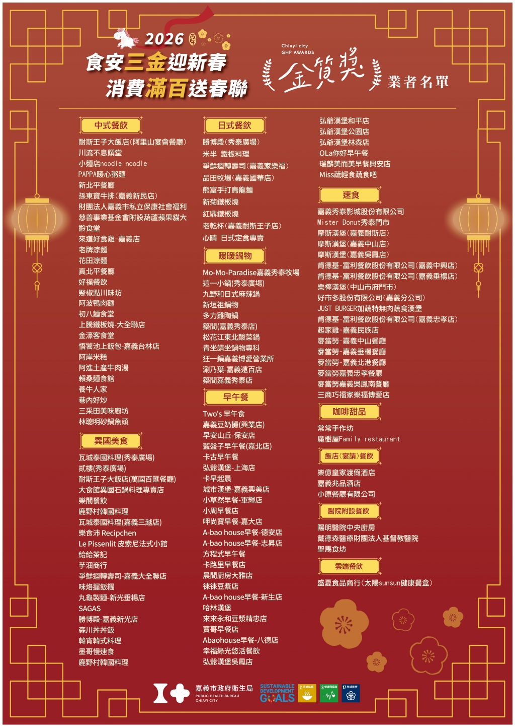 衛生局呼籲,民眾於春節採買及外食消費時,可優先選擇認明食安三金獎標章,以實際行動支持優質業者,共同打造嘉義市安全、永續的飲食環境。今年共有200家通過衛生局嚴格評核並持續列管的食安模範店家,參加「食安三金迎新春 消費滿百送春聯」活動,包含「金質獎」122家、「金(麥方ㄆㄤˋ)獎」48家及「金搖獎」30家。