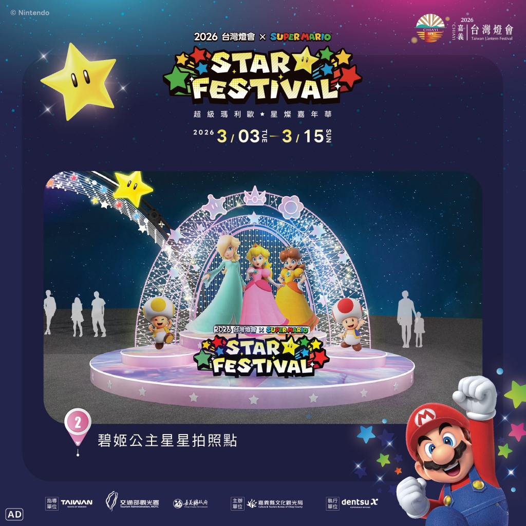 「2026台灣燈會 × 超級瑪利歐・星燦嘉年華」以《超級瑪利歐》系列角色與經典元素為整體設計主題,並以跳躍的「無敵星」作為串聯大小燈區的視覺主軸,搭配星星元素與燈光配置,讓參觀動線在燈區中自然延伸與展開。邀請大家走進燈區依照自己喜歡的步調,享受一場充滿樂趣與驚喜的台灣燈會。