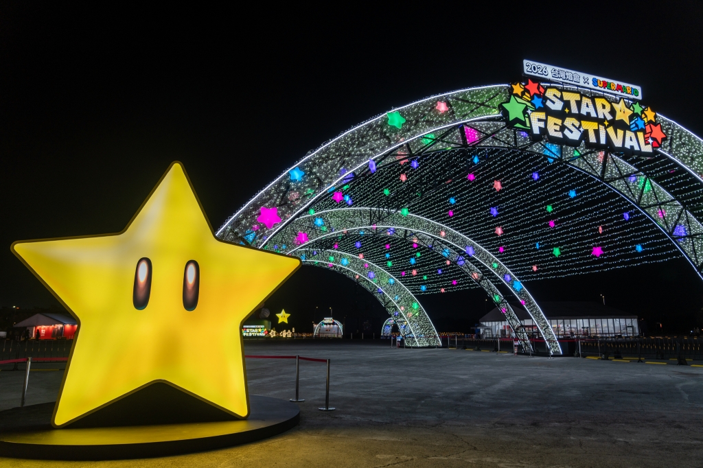 「無敵星迎賓之路」為燈會的動線起點,以無敵星與弧形燈光結構作為設計概念,搭配星星燈飾點綴,營造出明亮而充滿活力的燈區第一印象。入口處的大型無敵星點出此次「2026 台灣燈會 × 超級瑪利歐・星燦嘉年華」主題,為親子燈區後的首個拍照亮點。