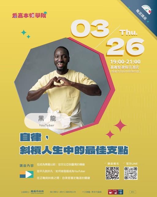 勞青處林家緯處長表示,嘉義市以有事青年實驗室作為青年政策品牌,向下梳理「多元培力」、「職涯就業」、「創業扶植」、「創新孵化」與「公共參與」五大核心,成為青年最堅強的後盾,「職涯就業」就是勞青處重點工作。數位遊牧、斜槓模式已成為年輕世代追求的重點職涯方向之一。以黑龍為例,從求學到就業已留台十三年,除了土木工程師的專業背景,更成功跨足新媒體領域,成為國際人才深耕台灣的典範。此次邀請他以「自律」為題,分享如何在繁忙的斜槓職涯中取得平衡,便是希望借重其跨國籍、跨領域的奮鬥經驗,作為嘉義青年的人生借鑑,鼓勵年輕一代勇於跳脫框架,在嘉義找到屬於自己的職涯定位與生命價值。